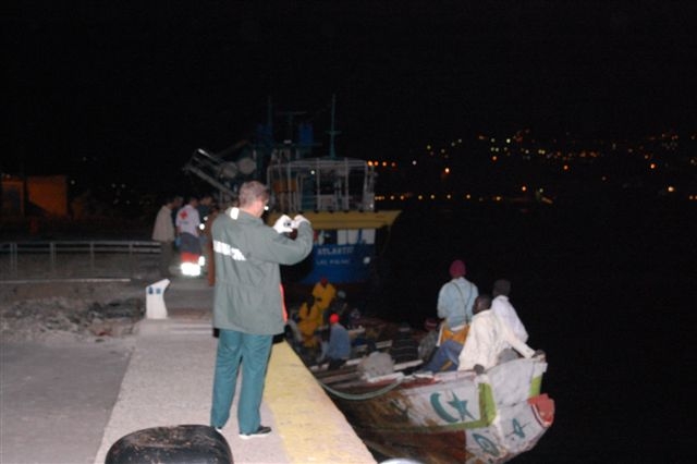Si alguno de ustedes pasó anoche por el Cuba Libro y lo vió cerrado, este fue el motivo. Recibí el mensaje del CCA sobre las 10.30 de la noche y salí para el puerto de Arguineguin. El dispositivo estaba ya montado cuando llegué, pero el cayuco estaba aún en altar mar. Entró en el muelle a la 1:15 de la madrugada.