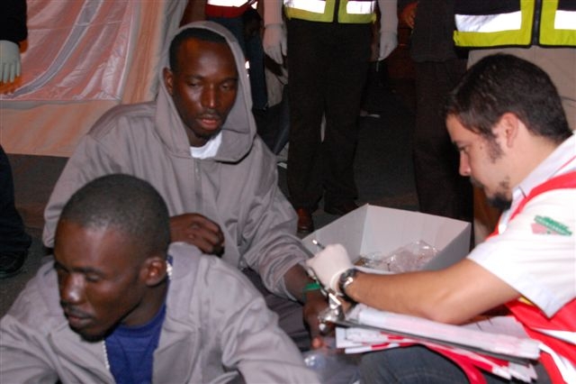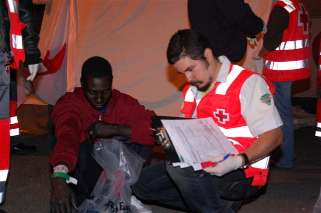 Después de que fueran desnudados y vestidos con los chándales de la Cruz Roja, y habiendo recibido una bolsa con comida y un te caliente, iban pasando a una pequeña explanada entre las carpas donde Gustavo, Marcos y yo les ibamos haciendo las fichas médicas. Me senté con ellos en el suelo, nos reímos juntos, les pregunté de donde venían: «Mali, Burkina Faso, Libia, Senegal». Al principio parecían asustados, luego ya tuvimos una conversación más distendida por señas (la mayoría hablaba francés y tengo que aprenderlo).