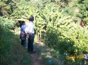 Así es el paraguayo que he conocido hasta el día de hoy: hospitalario y expontáneo. Da la sensación de que todos tienen algo que hacer, y todos saben bien cómo hacer lo que deben. Esta foto en la que salgo de espaldas se trata de una visita que hice a una comunidad en un lugar llamado Mariano Roque Alonso. No se aprecia, pero a la izquierda de mi compañera hay unas escalinatas escarbadas en la roca con una pendiente impresionante. Por ahí tuvimos que descender para llegar a la comunidad, en medio de esa mata de vegetación preciosa que se ve a mis pies. Hasta cuarenta viviendas se pueden encontrar por el camino que va acompañado por un riachuelo y varios cerdos durmiendo o paseando plácidamente. Un paraje realmente bello y tremendamente insalubre cuando a dengue, fiebre amarilla o malaria se refiere. Es sabido que los mosquitos ponen sus criaderos en las aguas estancadas, pero no pensemos en grandes lagos ni reservorios, antes bien, cualquier charco, sea dentro de un neumático o en las canaletas de drenaje de la lluvia en los techos de las casas, pueden convertirse en perfectas mansiones para estos insectos de la muerte.